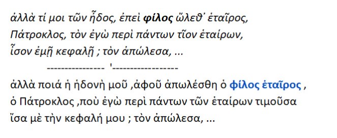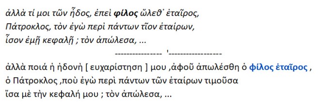 Η λέξη φίλος συναντάται στα Ομηρικά έπη . Ο Αχιλλέας θρηνεί τον Πάτροκλο.