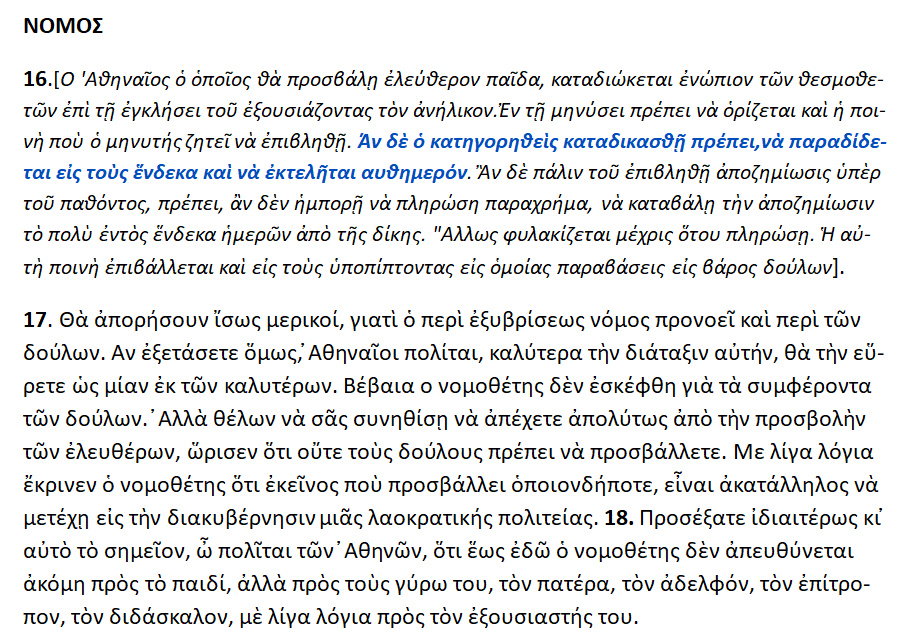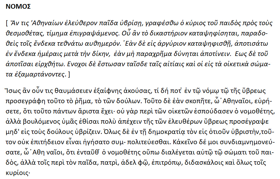 ΝΟΜΟΣ : Όποιος ασελγήσει πάνω σε παιδί ,σε γυναίκα ή άνδρα από τους ελεύθερους ή τους δούλους να καταγγέλλεται για διάπραξη δημοσίου αδικήματος.