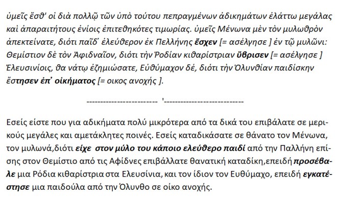 Αν αυτός που κατηγορείται ,ότι εξυβρίζει [ ασελγεί πάνω σε ] ελεύθερον ή δούλον παίδα, καταδικασθεί , πρέπει να παραδίδεται στους ένδεκα και να εκτελείται αυθημερόν.