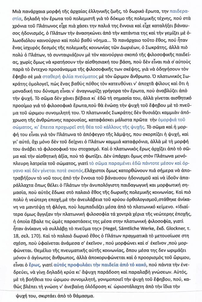 It is important to observe here the strong terms in which the unnatural character of these practices is denounced. An equally strong and more explicit passage occurs in the ‘Laws’ of Plato [ p. 636 b ], where the advantages and disadvantages of the gy–mnasia and syssitia are discussed .{ Είναι σημαντικό να παρατηρήσουμε εδώ τους έντονους όρους με τους οποίους καταγγέλ–λεται ο αφύσικος χαρακτήρας αυτών των πρακτικών. Ένα εξίσου ισχυρό και πιο σαφές απόσπασμα βρίσκεται στους »Νόμους» του Πλάτωνος [ 636 b ], όπου συζητούνται τα πλεονεκτήματα και τα μειονεκτήματα των γυμνασίων και των συσσιτίων }.