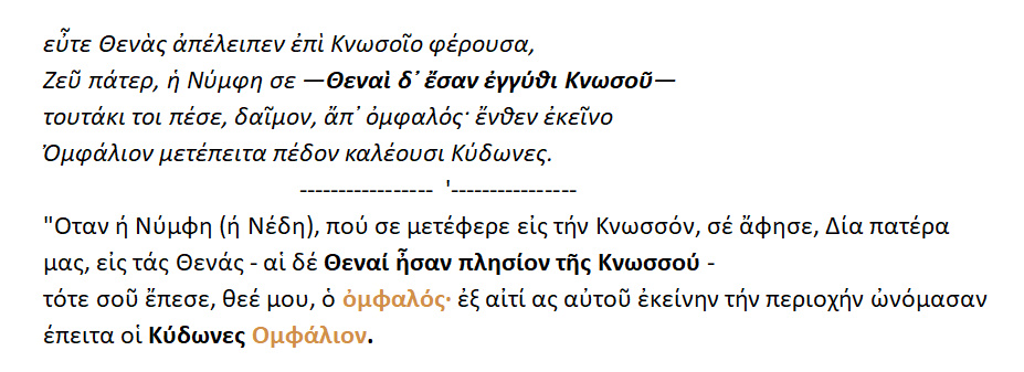 Η νύμφη Νέδη πήρε τον Δία από την Αρκαδία και τον πήγε στις Θένες [ κοντά στην Κνωσσό].