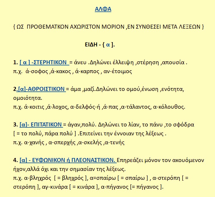 Το πρώτο γράμμα του ελληνικού αλφαβήτου, καθώς και όλων των αλφαβήτων, που προέρχονται, αμέσως ή εμμέσως εκ του ελληνικού, λατινικού, κυριλλικού, γοτθικού κλπ. Επίσης το πρώτο γράμμα των υπολοίπων θεμελιωδών άλφα- βήτων, από τα οποία προέρχονται όλα τ’ άλλα. Η ομοιότητα όμως αυτή των αλφαβήτων περιορίζεται μόνον εις το Α, και όχι στα υπόλοιπα γράμματα, τα οποία παρουσιάζουν, και ως προς το ελληνικόν και μεταξύ τους , πολλές διαφορές τόσον ως προς τους δηλουμένους φθόγγους, όσον και ως προς την σειρά κατατάξεως αυτών. Ούτε δε έχουν ταύτα και τελευταίο γράμμα το ίδιον. ( Το ελληνικόν, ως γνωστόν, λήγει εις «Ω», το λατινικόν εις «Ζ», το σημιτικόν εις «Τ» ). Η διαφορά αυτή μαρτυρεί περί της καθολικής, παγκοσμίου και πρωταρχικής σημασίας του «Α».