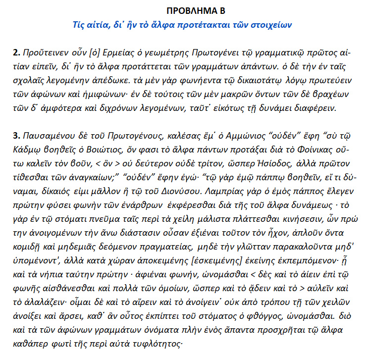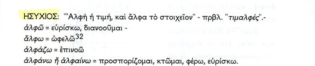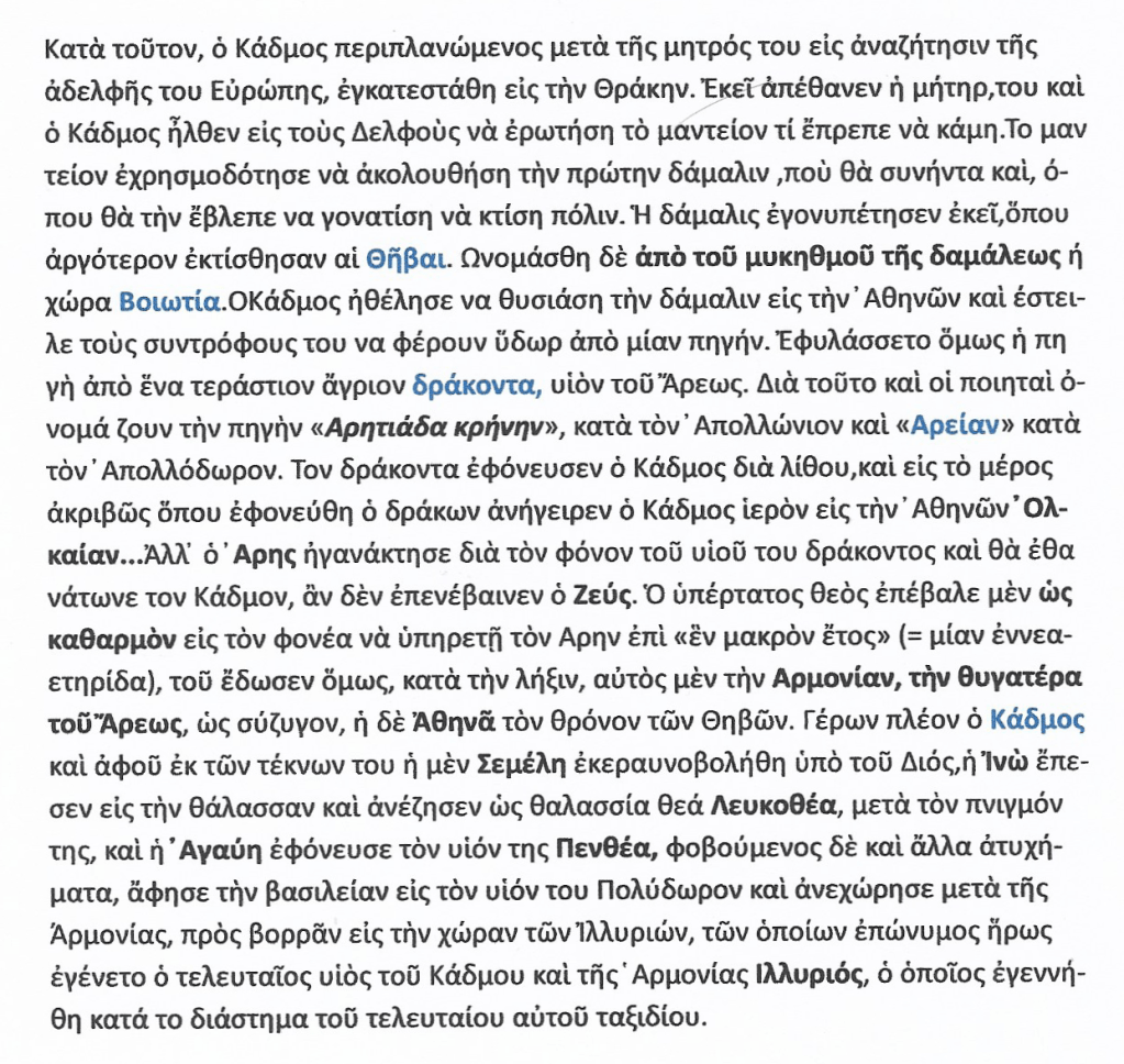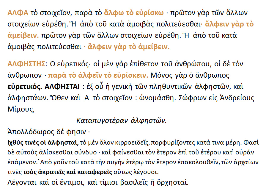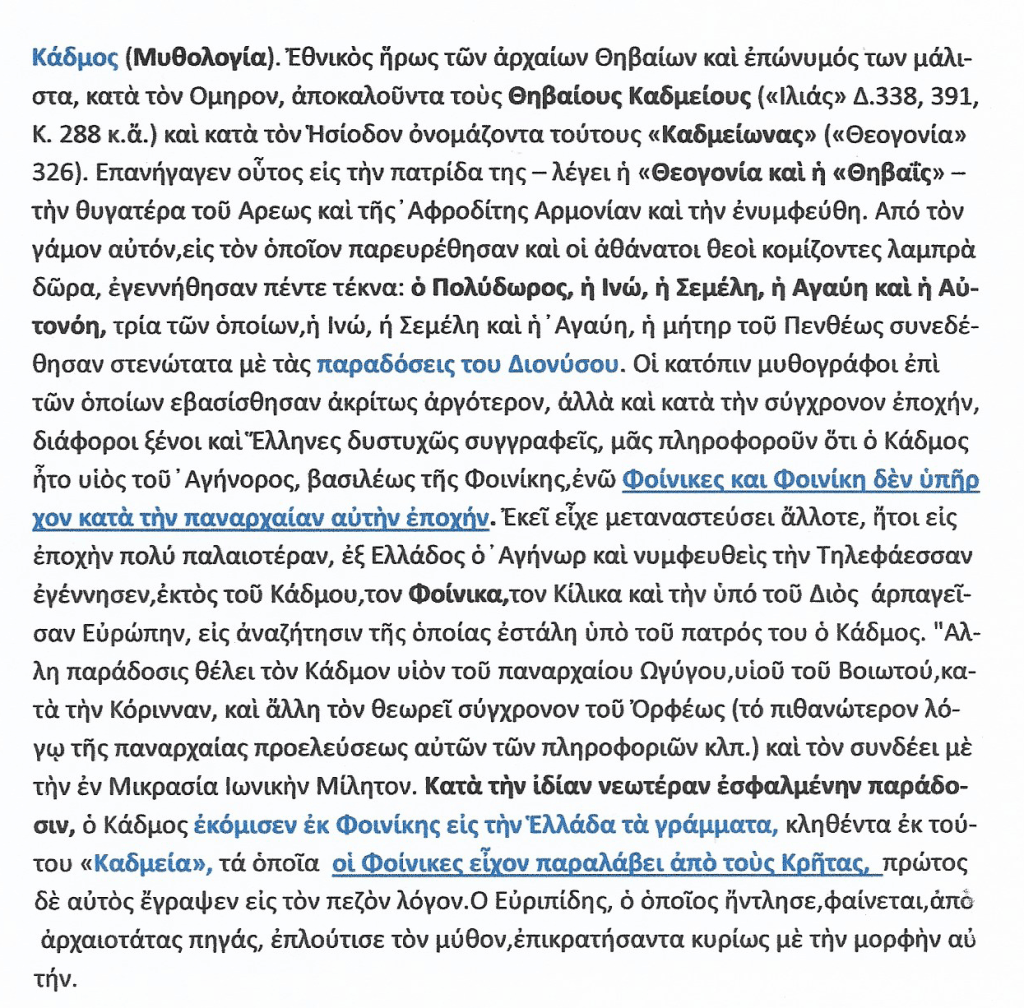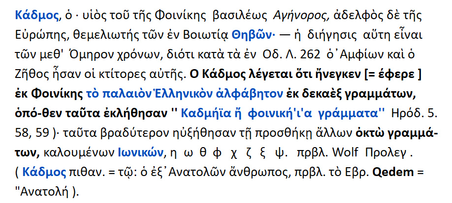 Ὁ Κάδμος λέγεται ότι ήνεγκεν [ = έφερε, μετέφερε ] εκ Φοινίκης το παλαιὸν Ελληνικὸν Αλφάβητον εκ δεκαέξι γραμμάτων, [ 16 ] οπόθεν [= απ’ όπου ] ταύτα εκλήθησαν » Καδμήϊα ή φοινική’ι’α γράμματα».