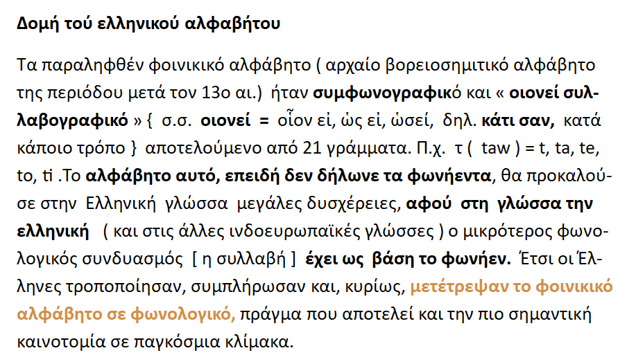 Το Φοινικικό αλφάβητο ήταν συμφωνογραφικό { δηλ. χωρίς φωνήεντα , μόνον σύμφωνα }.