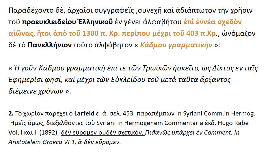 Οι αρχαίοι συγγραφείς παραδέχονται συνεχή και αδιάλειπτη χρήση του Ελληνικού εν γένει προευκλειδείου αλφα-βήτου επί εννέα σχεδόν αιώνες { 1300 π.Χ. – 403 π.Χ. }. Το Πανελλήνιον ονόμαζε αυτό το αλφάβητον » ΚΑΔΜΟΥ ΓΡΑΜΜΑΤΙΚΗ ‘‘.