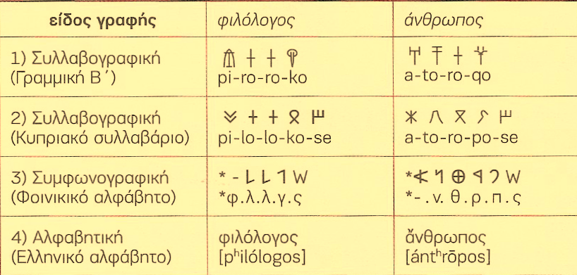 ΠΙΝΑΞ 5. Δύο λέξεις σε τέσσερεις διαφορετικές γραφές .
