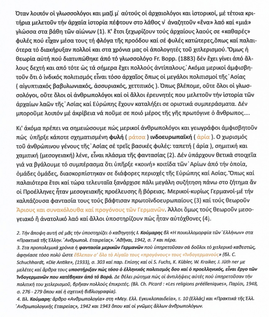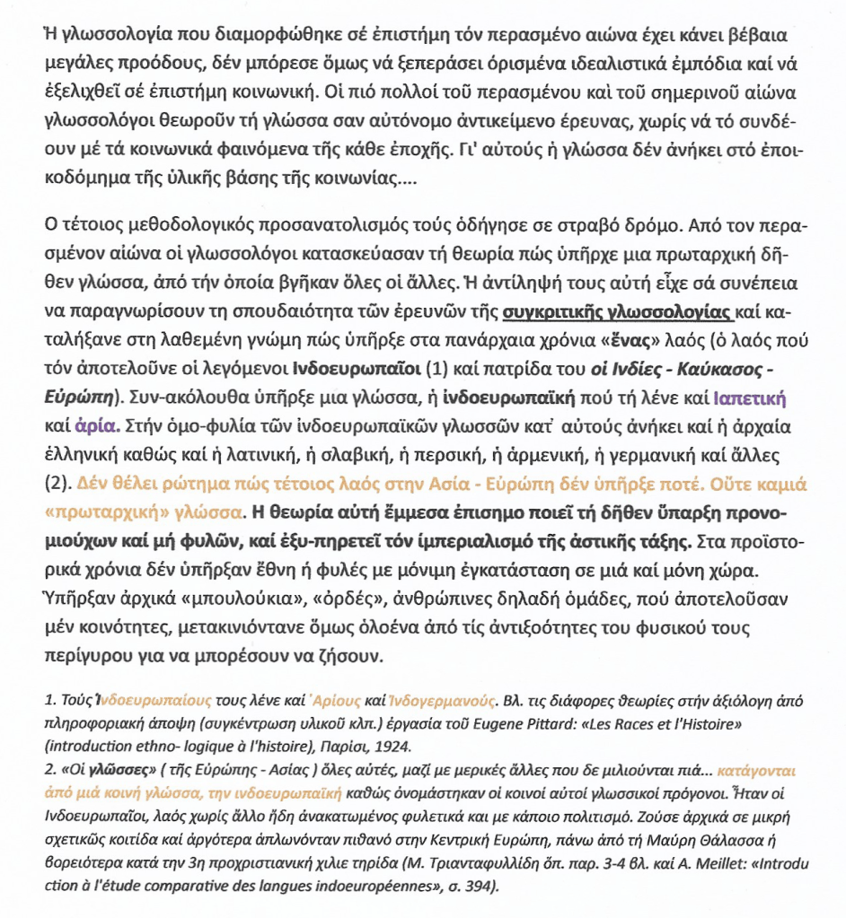ΟΙ ΠΡΟΕΛΛΗΝΕΣ. » Δεν θέλει ρώτημα πως τέτοιος λαός [ ΙΝΔΟΕΥΡΩΠΑΙΟΙ ] στην Ασία – Ευρώπη δεν υπήρξε ποτέ. Ούτε καμιά «πρωταρχική» γλώσσα. Η θεωρία αυτή έμμεσα επισημοποιεί τη δήθεν ύπαρξη προνομιούχων και μη φυλών, και εξυπηρετεί τον ιμπεριαλισμό της αστικής τάξης.
