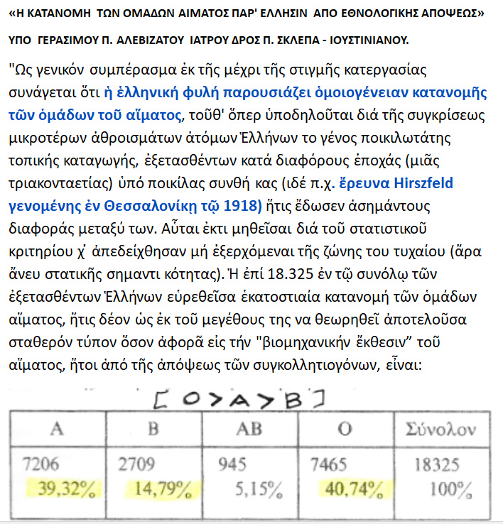 ΠΑΡΑΡΤΗΜΑ Γ’. Αλιβιζάτος Π. Γερ και Σκλέπας – Ιουστινιανός Π -«Η κατανομή των ομάδων αίματος παρ’ Έλλησι από εθνολογικής απόψεως », Ελληνική Ιατρική, τεύχ. 10, Θεσσαλονίκη, {10 / 1948 }. << Ως γενικό συμπέρασμα συνάγεται ότι η ελληνική φυλή παρουσιάζει ομοιογένεια κατανομής των ομάδων του αίματος >>.