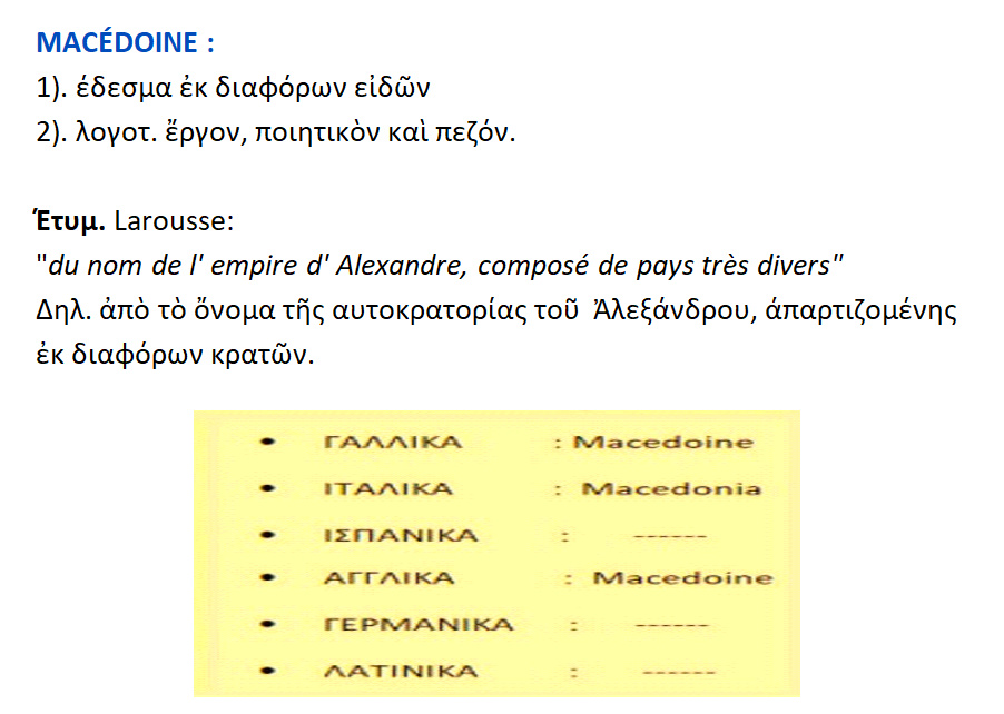 Μacedoine : 1.Έδεσμα εκ διαφόρων ειδών 2. Λογοτεχνικόν έργον { ποιητικόν και πεζόν }.Το έδεσμα ονομάστηκε ‘macedoine’ από το όνομα της Αυτοκρατορίας του Αλεξάνδρου ,απαρτιζομένης εκ πολλών κρατών.