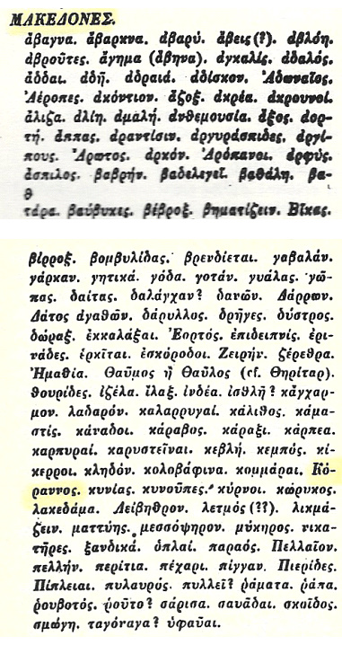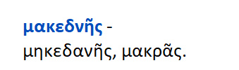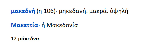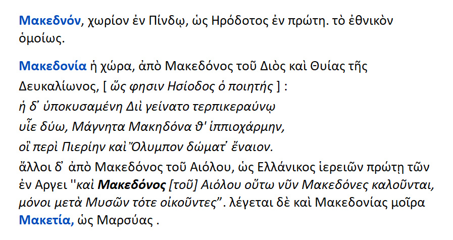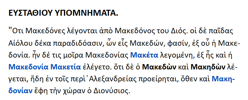 Υπομνήματα [ 427 ] : Υπήρχε δε κάποια μοίρα [=κομμάτι] της Μακεδονίας που λεγόταν Μακετία , απ’ αυτήν και η Μακεδονία ονομάζεται Μακετία. Ο Μακεδών λέγεται και Μακηδών.