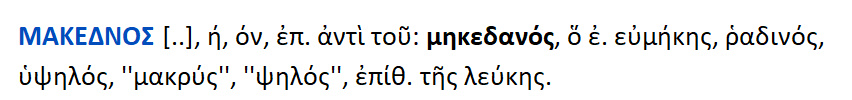 Μακεδνός = μηκεδανός , υψηλός ,μακρύς ,’ψηλός’. Επίθετο της λεύκης.