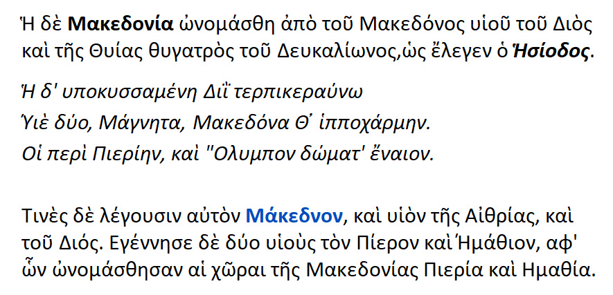 Μακεδονία ονομάστηκε από τον Μακεδόνα, υιόν του Διός και της Θυίας, θυγατέρας του Δευκαλίωνος. Κάποιοι δε ονομάζουν αυτόν Μάκεδνον και υιόν της Αιθρίας και του Διός.