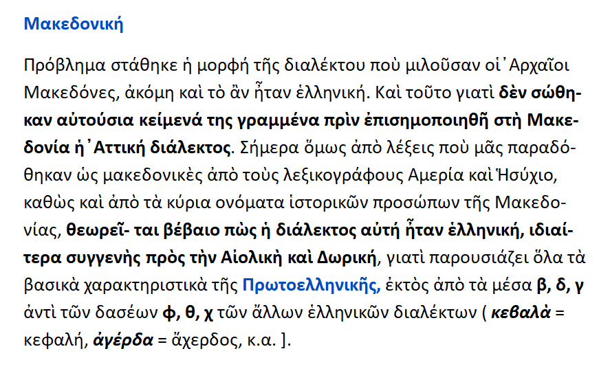 Μακεδονική : θεωρείται βέβαιο πως η διάλεκτος αυτή ήταν ελληνική , ιδιαίτερα συγγενής προς την Αιολική και Δωρική.