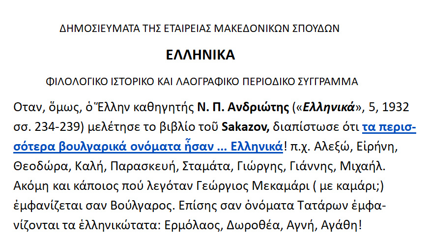 Όταν καθηγητής Γλωσσολογίας Ν.Π.Ανδριώτης μελέτησε το βιβλίο του Sakazov διαπίστωσε , ότι τα περισσότερα βουλγάρικα ονόματα ήσαν …Ελληνικά.!