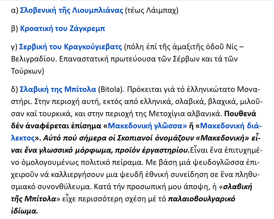 Αυτό που σήμερα οι Σκοπιανοί ονομάζουν <<Μακεδονική >> είναι ένα γλωσσικό μόρφωμα , προ’ι’όν εργαστηρίου .Είναι ένα επιτυχημένο πολιτικό πείραμα.! Η << σλαβική της Μπίτολα >> είχε περισσότερο σχέση με το παλαιοβουλγαρικό ιδίωμα.