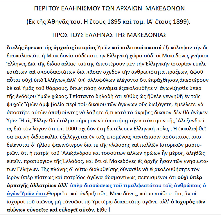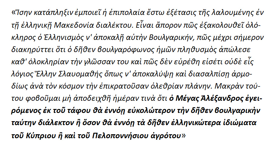 »φοβάμαι , μήπως κάποια μέρα αποδειχθεί ,ότι ο Μέγας Αλέξανδρος αναστημένος από τον τάφο θα μπορεί να καταλαβαίνει ευκολότερα την δήθεν βουλγαρική αυτή διάλεκτο απ’ όσον θα μπορεί να καταλάβει τα δήθεν ελληνικότερα ιδιώματα του Κύπριου ή και του Πελοποννήσιου αγρότη.»