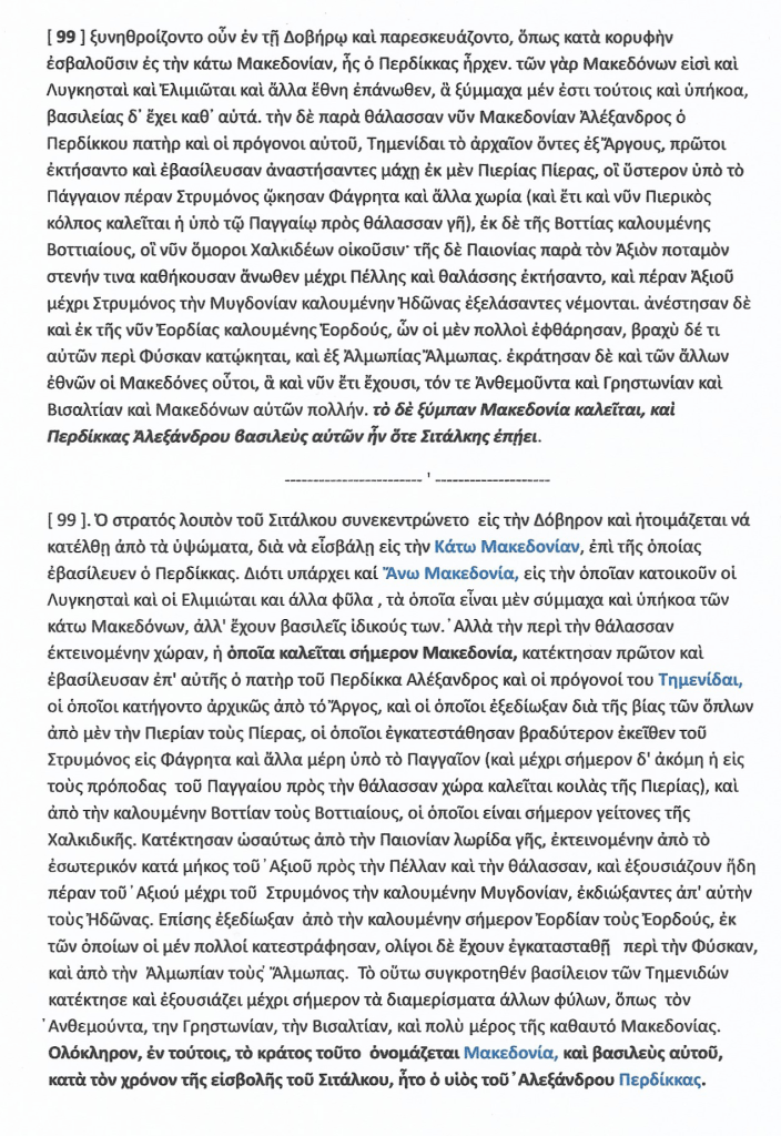 << Στην Κάτω Μακεδονία βασίλευεν ο Περδίκκας. Διότι υπάρχει και η Άνω Μακεδονία στην οποία κατοικούν οι Λυγκησταί και οι Ελιμιώται και άλλα φύλα τα οποία είναι μεν σύμμαχοι και ΥΠΗΚΟΟΙ των Μακεδόνων αλλ’ έχουν βασιλείς δικούς τους. Αλλά την περί την θάλασσαν εκτεινομένην χώραν , η οποία καλείται σήμερα Μακεδονίαν κατέκτησαν πρώτον και βασίλευσαν επ’αυτής ο πατέρας του Περδίκκα Αλέξανδρος και οι πρόγονοί του Τημενίδαι , οι οποίοι κατάγονταν αρχικώς από το ΑΡΓΟΣ.…Ολόκληρον ,εν τούτοις ,το κράτος τούτο ονομάζεται Μακεδονία, και ο βασιλιάς αυτού ,κατά τον χρόνο της εισβολής του Σιτάλκου , ήταν ο υιός του Αλεξάνδρου [Α’] Περδίκκας [Β’] >>.
