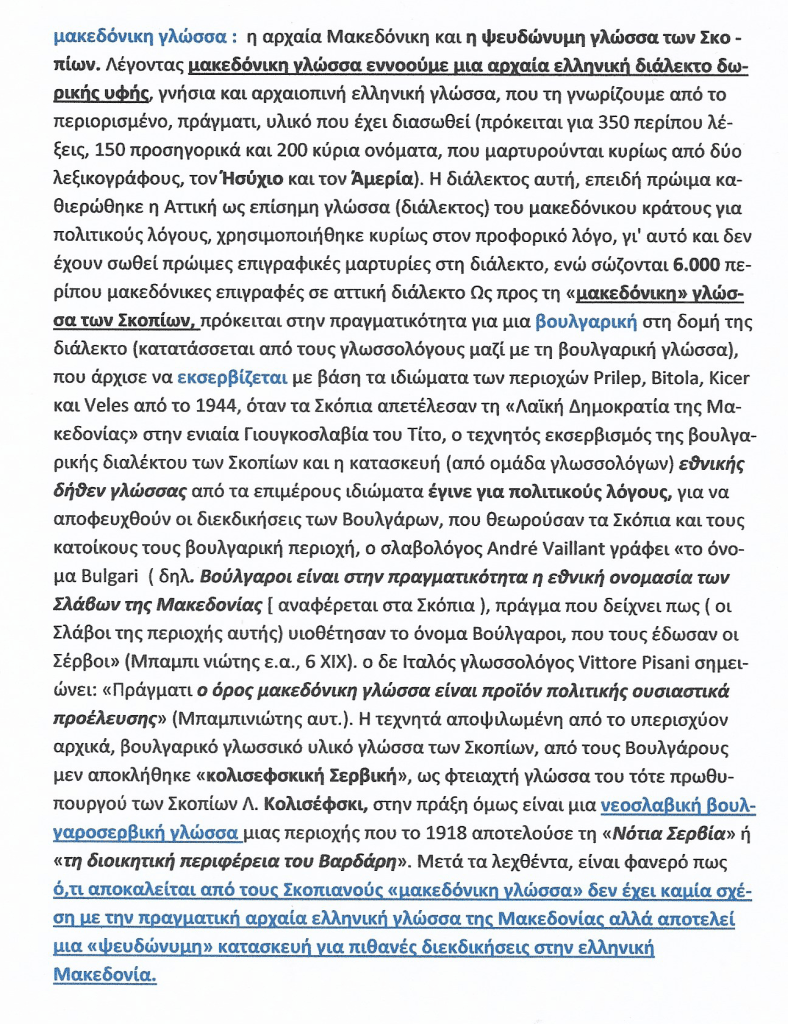 << Άρα, η γλώσσα των Σκοπίων είναι μια σερβοβουλγαρική γλώσσα μια τεχνητά εκσερβισμένη Βουλγαρική, που επιβλήθηκε ως επίσημη γλώσσα για προφανείς λόγους και που οι Βούλγαροι την ονόμασαν «κολισεφσκική» γλώσσα.Από μόνοι τους οι Σκοπιανοί έδωσαν σε αυτή τη γλώσσα, τη Σερβοβουλγαρική, την παραπλανητική και ψευδώνυμη ονομασία «Μακεδονική» (!), ώστε να αποφύγουν τις βουλγαρικές διεκδικήσεις και να αποκρύψουν μαζί τη βουλγαρική προέλευση τής γλώσσας τους. >>Η «Μακεδονική» των Σκοπίων και τα περί σλαβομακεδονικής μειονότητας
