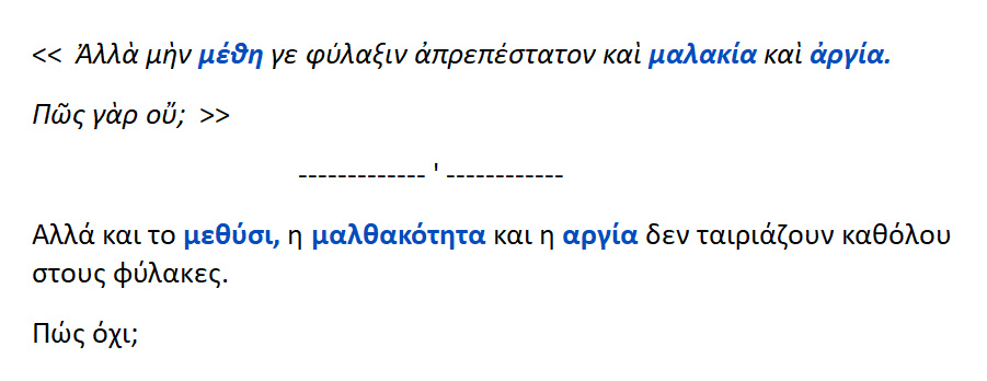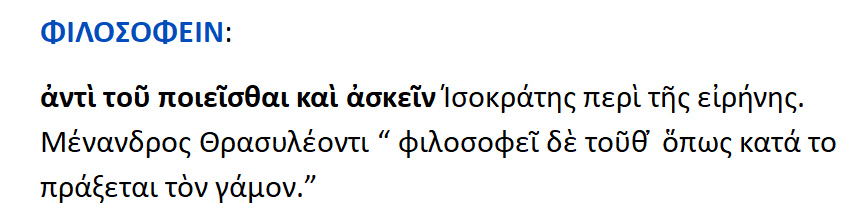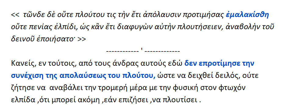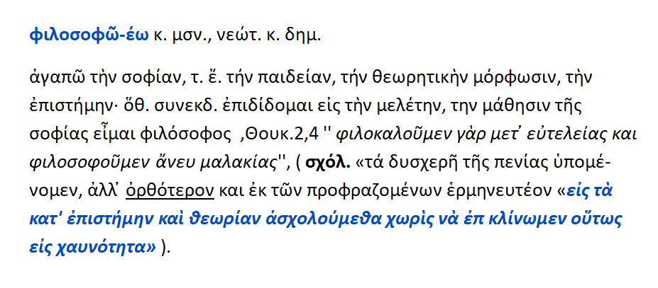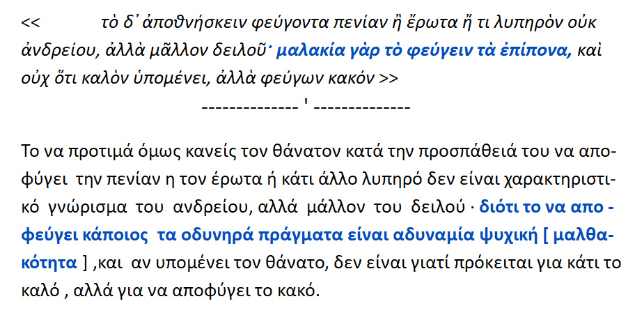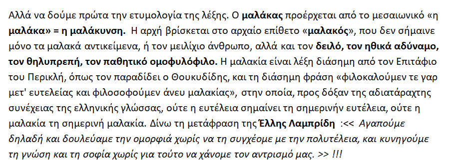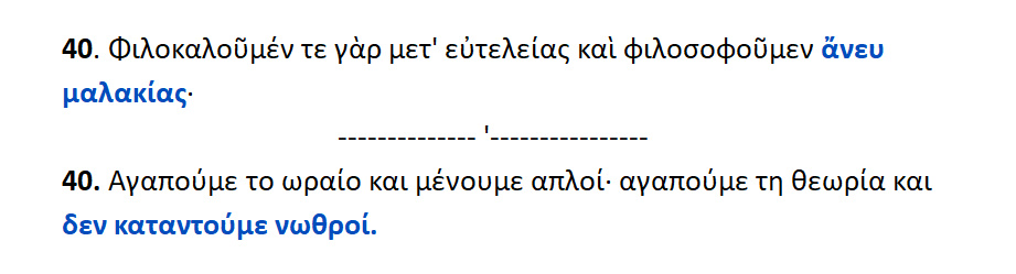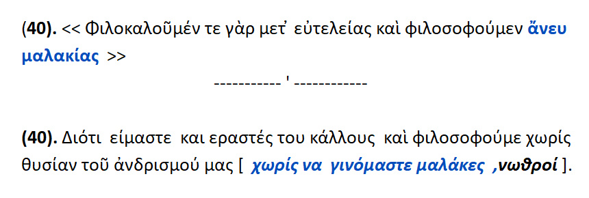 Η επίμαχη και τόσο πολυσυζητημένη φράση στο Κεφ. 40 ,Β’ τόμ. από τον »Επιτάφιο» του Περικλέους {ή του Θουκυδίδου } : << φιλοσοφούμεν άνευ μαλακίας >>.