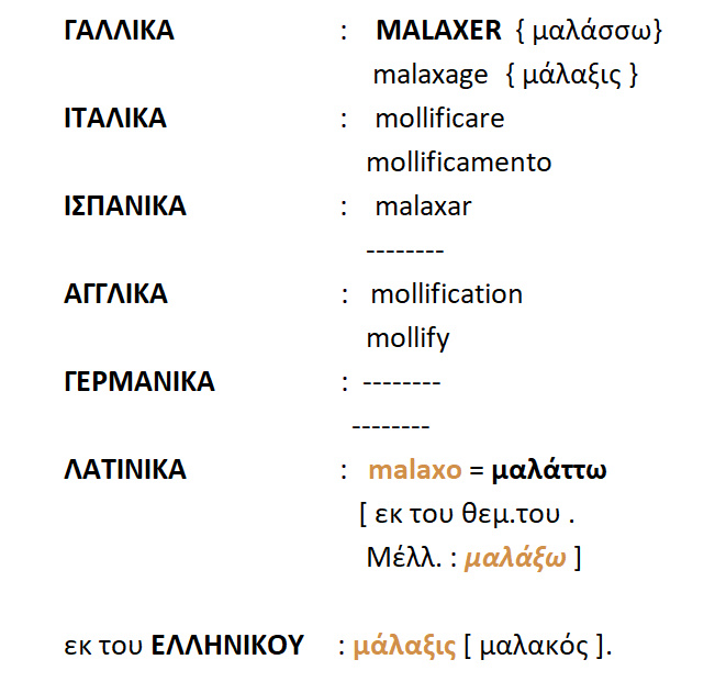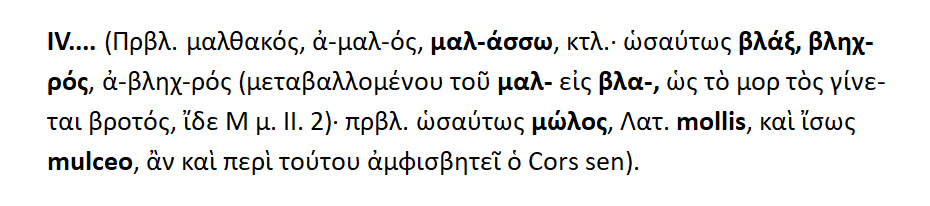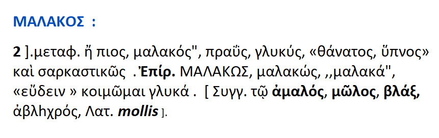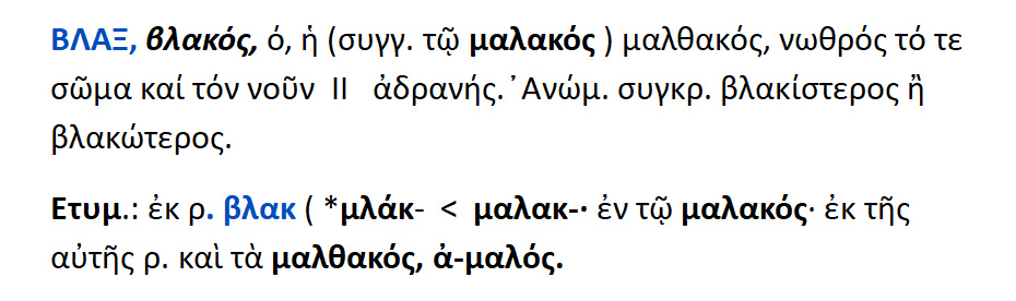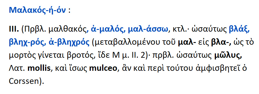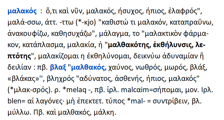 Μαλακός { < μαλάσσω,μαλάττω } = βλάξ , μαλθακός.