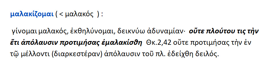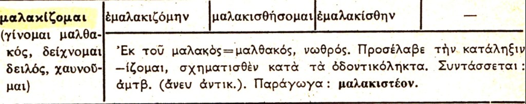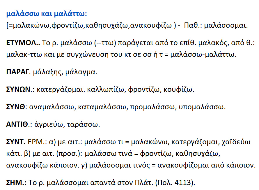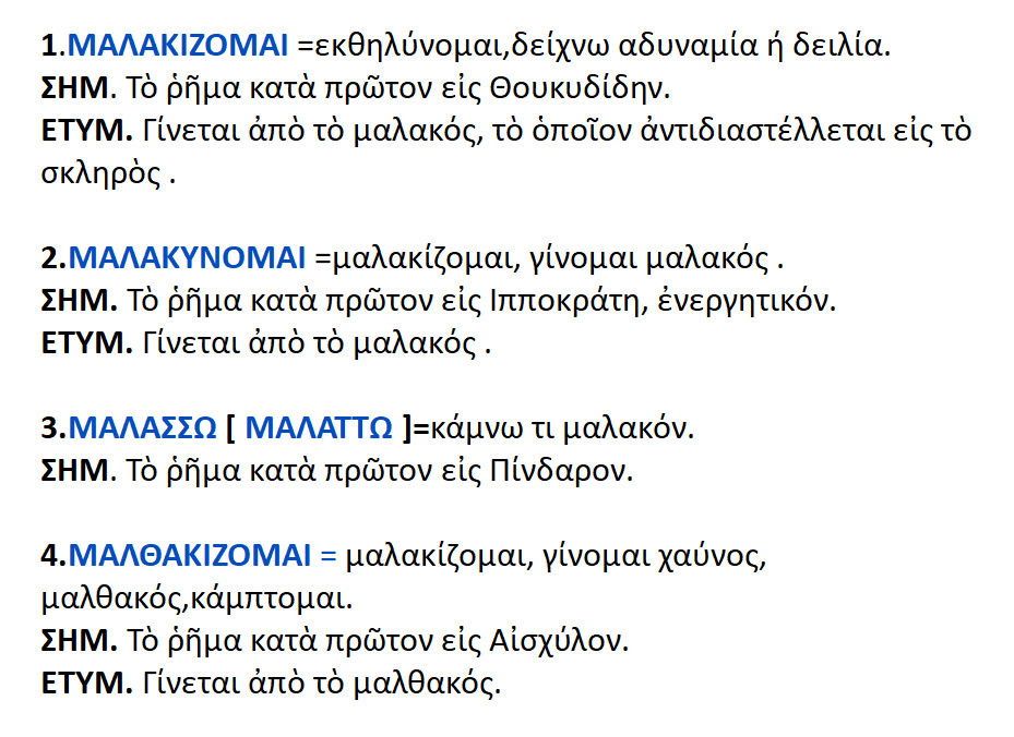 Το ΜΑΛΑΚΟΣ και τα παρεμφερούς σημασίας ρήματα. 1.ΜΑΛΑΚΙΖΟΜΑΙ . 2.ΜΑΛΑΚΥΝΟΜΑΙ 3.ΜΑΛΑΣΣΩ [ΜΑΛΑΤΤΩ 4.ΜΑΛΘΑΚΙΖΟΜΑΙ.