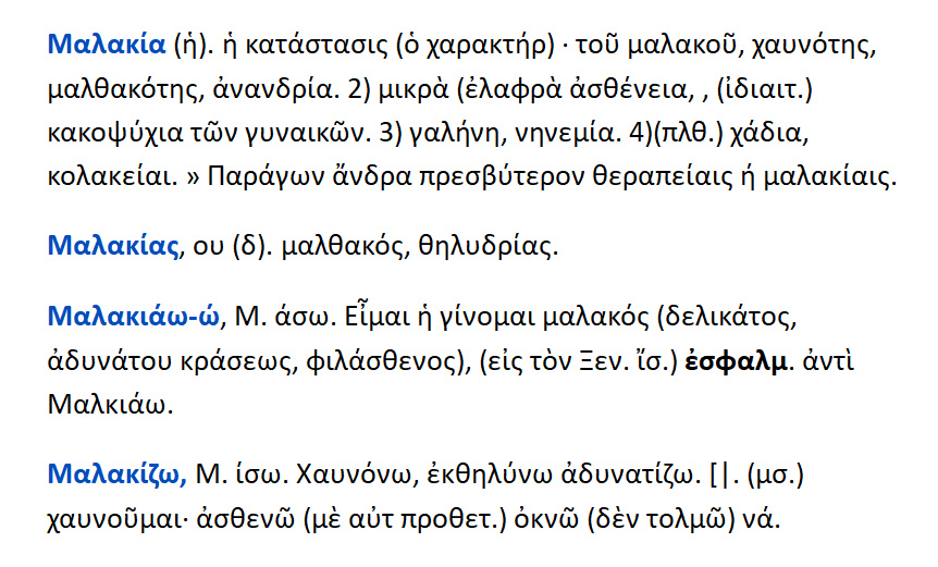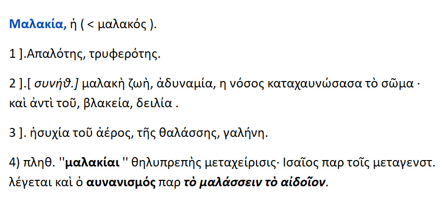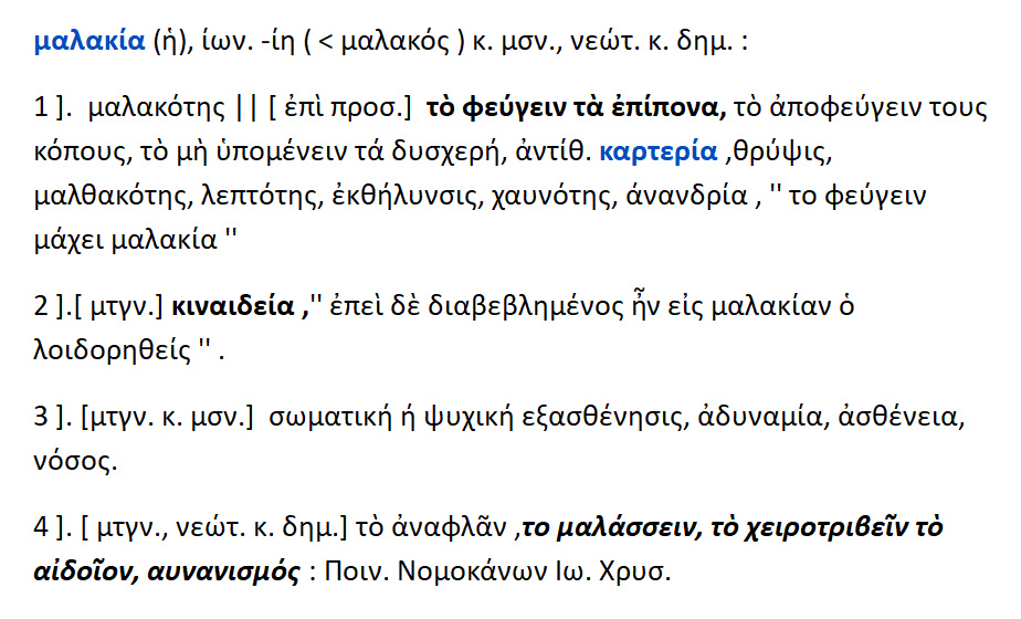 Μαλακία = το αποφεύγειν τους πόνους { κόπους }, το να μήν υπομένεις τις συσχέρειες, μαλθακότητα, εκθήλυνση ,χαυνότητα, ανανδρία.ΑΝΤΙΘ. Η καρτερία.