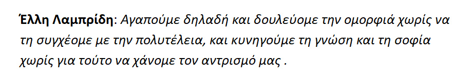 * »δουλεύουμε » την ομορφιά ; [μεροδούλι – μεροφάι ,που λέει ] ..να την συγχέουμε με την πολυτέλεια ; [ στο συγχυσμένο μου μυαλό ;] …κυνηγάμε {;} την γνώση και την σοφία ; [ κυνήγι με σκυλιά ή χωρίς ;]..