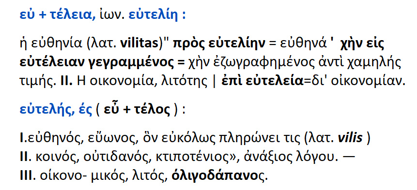 εὐ + τέλεια [ εὐτελίη ] , εὐτελής -ές ( εὖ + τέλος ) .