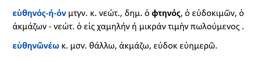 4.Η ευθηνία {= ευ + θηνέω-ώ } ή Ευθενία {= ευ + θενέω-ώ } [δλδ. η φτήνια].