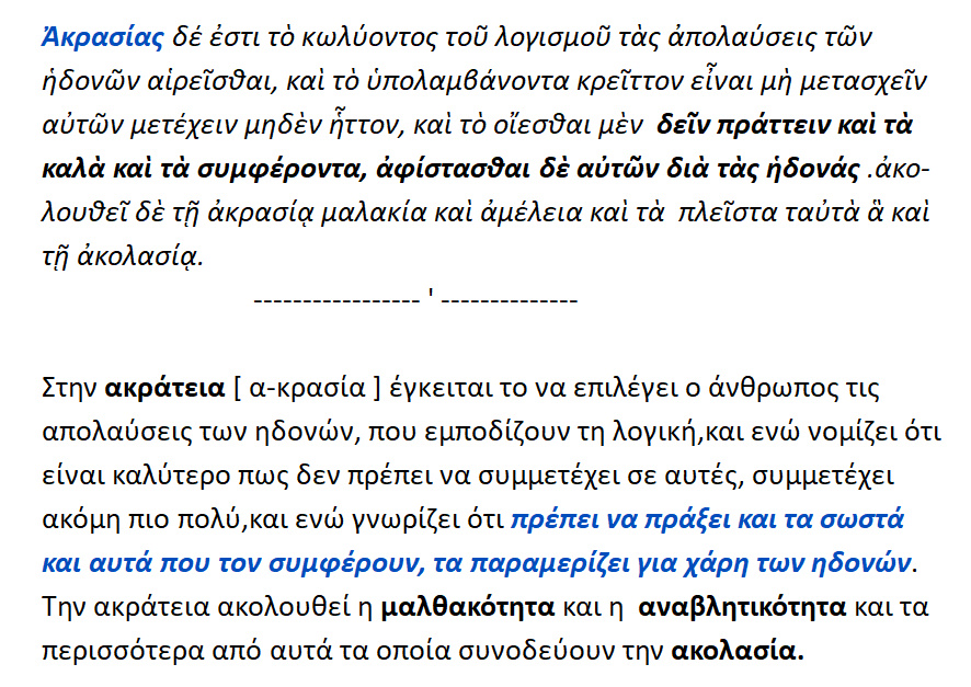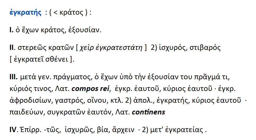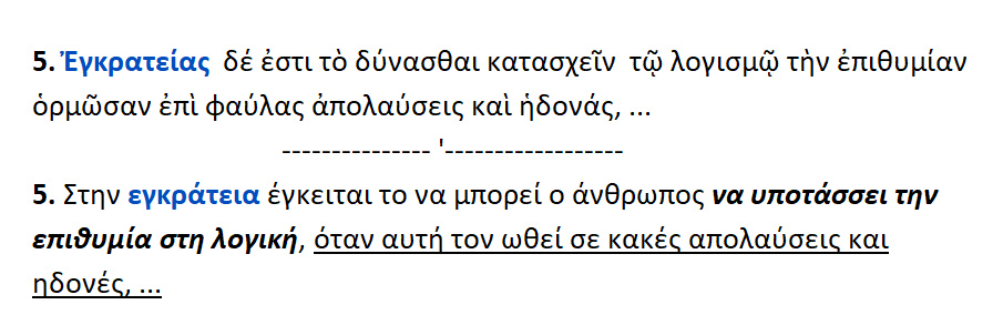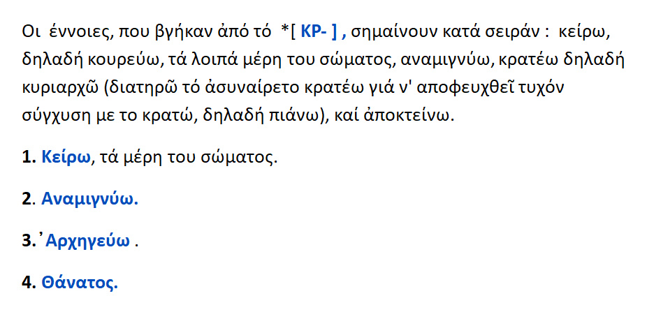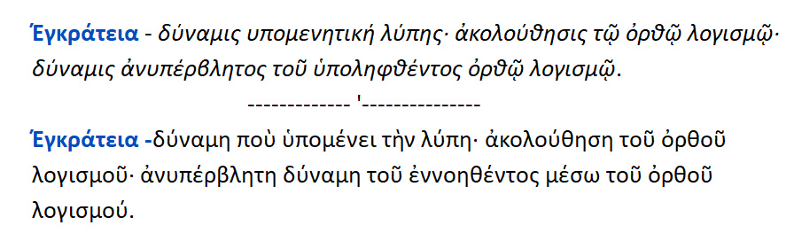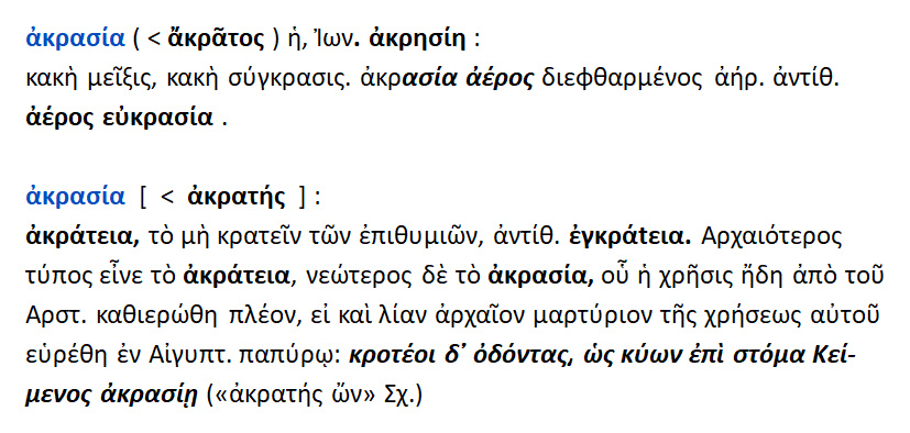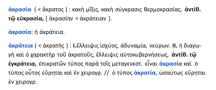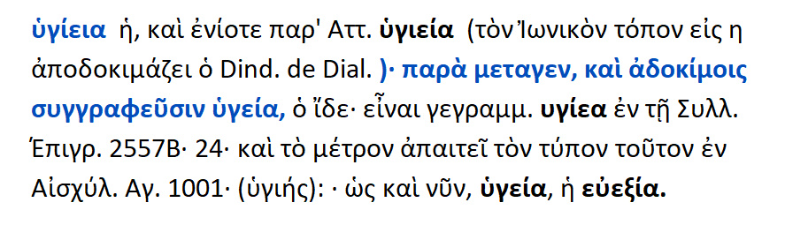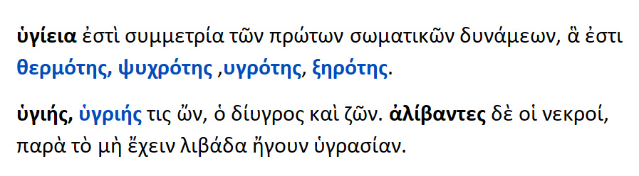 Η υγίεια { η σωστή αναλογία , η κράσις των πρωταρχικών σωματικών δυνάμεων { Θερμού ,Ψυχρού, Υγρού, Ξηρού } και ο υγιής είναι ο υγριής { αλίβαντες [ = α + λείβω ] είναι οι νεκροί }.
