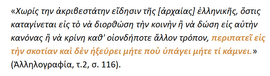 Έλληνας ασφαλώς δεν γίνεσαι ,εάν γράψεις ‘πόλις ‘ αντί να γράψεις ‘πόλη’ ,όπως το γράφουν σήμερα .Ούτε εάν κάνεις το αντίθετο. Έλληνας γίνεσαι εάν σέβεσαι την γλώσσα σου ,εάν δεν την αλλοιώνεις εκουσίως και προπαντός εάν κατανοείς την ουσία της λέξεως { ετυμολογία}.Κι αυτό όμως δεν είναι αρκετό, εάν δεν συνοδεύεται με πράξεις αντάξιες του τίτλου τιμής : Έλληνας .