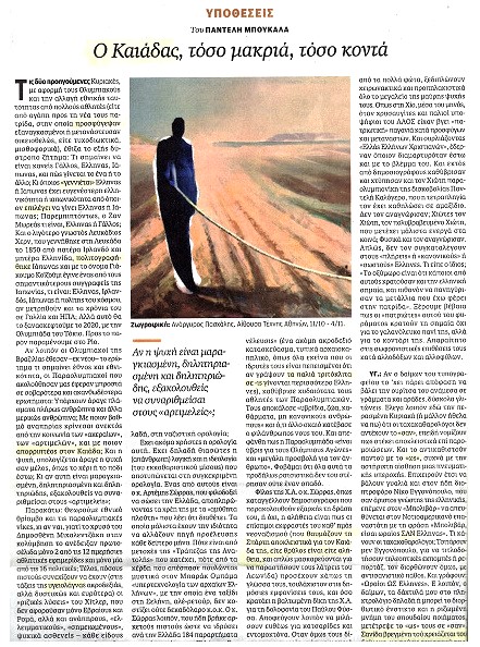 »Ο Καιάδας, τόσο μακριά, τόσο κοντά » γράφει ο καλός ποιητής και αρθρογράφος της εφ. Καθημερινής κ. Μπουκάλας. Η ομορφιά όμως ενός άρθρου κρίνεται από την ωφέλειά του και η ωφέλεια ενός άρθρου κρίνεται από την σαφήνειά του. Γιατί ‘Σοφόν το σαφές ‘ έλεγαν οι αρχαίοι πρόγονοί μας .Όσο δηλαδή σαφήνεια και καθαρότητα έχει ένα κείμενο ,τόσο σοφία περιέχει. Αντίθετα όσο ασάφεια ,θολούρα, σύγχυση ανάμεσα σε παρεμφερείς στο νόημα λέξεις { όμοιες } μαζί με την αδυναμία του διαχωρισμού και τονισμού των διαφορών των λέξεων αυτών { διάφορες } έχει το κείμενο, τόσο απομακρύνεται από την σοφία και την φιλοσοφία. Ψιλά γράμματα -ίσως – στις ζοφερές, »μνημονιακές » μέρες ,που ζούμε ,αλλά όχι εις μάτην. Η ορθογραφία ,τα ανώμαλα ρήματα ,η ετυμολογία είναι τα εργαλεία της γλώσσας μας με στόχο την ορθή σκέψη .Η σωστή σκέψη {ορθή}είναι η αρχή της σωστής { ορθής} πράξεως. Από το’ »μνημονιακό’ ψέκασμα όμως ,από την παραζάλη μιας μεθυσμένης πολιτείας ,από την ρευστότητα και την κατάρρευση ενός κόσμου παρακμασμένου δεν γλιτώνουν δυστυχώς , ούτε οι δεινοί χειριστές του γραπτού λόγου ,όπως ο κ .Μπουκάλας.