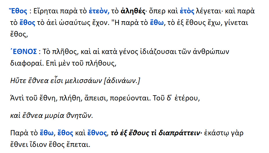 Έθω > έθος [ ετός =πραγματικός ,αληθής] > έθ{ν}ος.