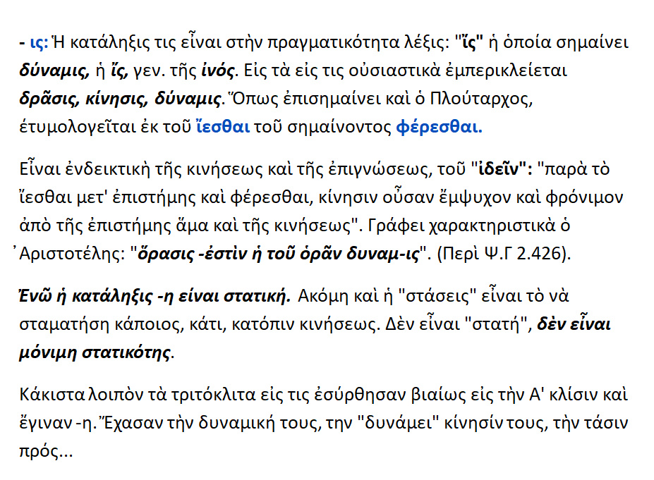 Υπάρχει νοηματική διαφορά μεταξύ της καταλήξεως [-ις ] και [ –η ] .Π.χ. το ουσιαστικό πόλις [ αφηρημένο και εν κινήσει } διαφέρει από το πόλη { συγκεκριμένο και εν στάσει }.Διότι η πόλ –ις** { =δύναμις } είναι η δύναμις του πολείν { < πολέω-ω } .Η κίνησ-ις ,η δύναμις του κινείν .Η πράξις ,η δύναμις του πράττειν .Η όρασις ,η δύναμις του οράν. Η πόλ-η* { »ος , η*, ον» : δεικτική αντωνυμία = αυτός, αυτή, αυτό }.Διαφέρει λοιπόν το αφηρημένο του συγκεκριμένου.