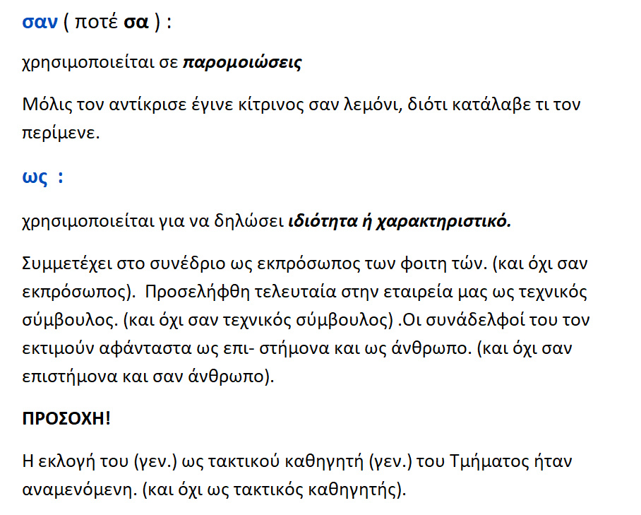 6]Γράφει ο αρθρογράφος …» ήθελα να πω, ότι οι τάχα καθαρολόγοι δεν αντέχουν το «σαν», επειδή νομίζουν πως στέκει αποκλειστικά επί παρομοιώσεων. Και το αντικαθιστούν παντού με το «ως», συχνά με την αστήριχτη αίσθηση μιας πνευματικής υπεροχής. Επιχειρούν έτσι να βάλουν γυαλιά και στον ήδη διοπτροφόρο Νίκο Εγγονόπουλο, που σαν άριστος γνώστης της ελληνικής, επέμενε στον «Μπολιβάρ» να απευθύνεται στον Νοτιαμερικανό επαναστάτη με τη φράση «Μπολιβάρ, είσαι ωραίος ΣΑΝ Έλληνας». ..!