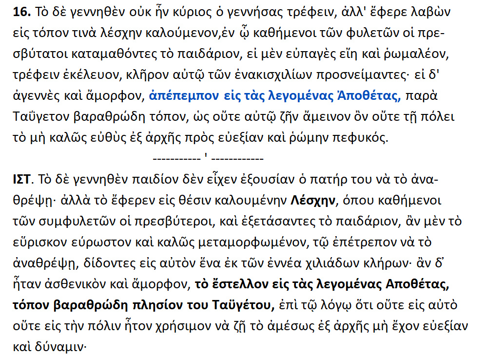 Αι Αποθέται . Το ρήμα ‘απέπεμπον‘ ,σημαίνει το έδιωχναν ,το έστελναν στις λεγόμενες Αποθέτες {= σε αυτές τις τοποθεσίες απέθεταν τα βρέφη , δεν τα έρριπταν στον Καιάδα },σύμφωνα με τον Πλούταρχο.
