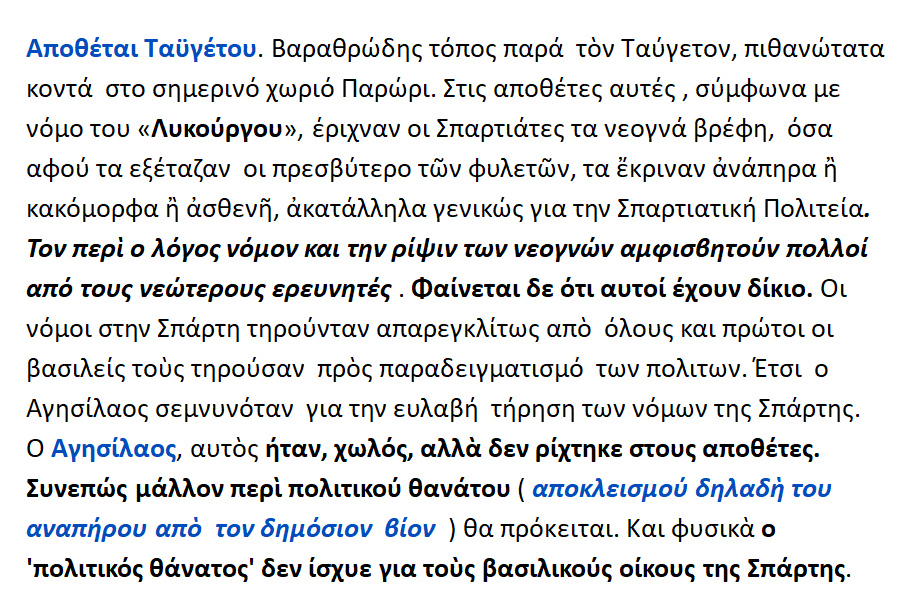 Αποθέται Ταΰγετου. Ο Αγησίλαος, αν και ήταν, χωλός, δεν ρίχτηκε στις αποθέτες. Συνεπώς μάλλον περὶ πολιτικού θανάτου ( αποκλεισμού δηλαδή του αναπήρου απὸ τον δημόσιον βίον ) θα πρόκειται.