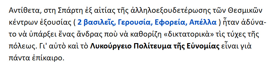 Το πολίτευμα της Σπάρτης ήταν πολύπλοκο . Δηλαδή , ήταν μικτό [ Ολιγαρχικό – Βασιλικό- Απέλλα ] , ήταν κλειστό { λόγω ξενηλασίας } ,μυστηριώδες { λόγω ελλείψεως επαρκών πηγών } και δυσφημισμένο [ λόγω παρα-ποιήσεων από Ναζιστικά και ακροδεξιά κόμματα ευρωπαϊκά ή μη ]. Το παράξενο πολίτευμα της Σπάρτης είχε :