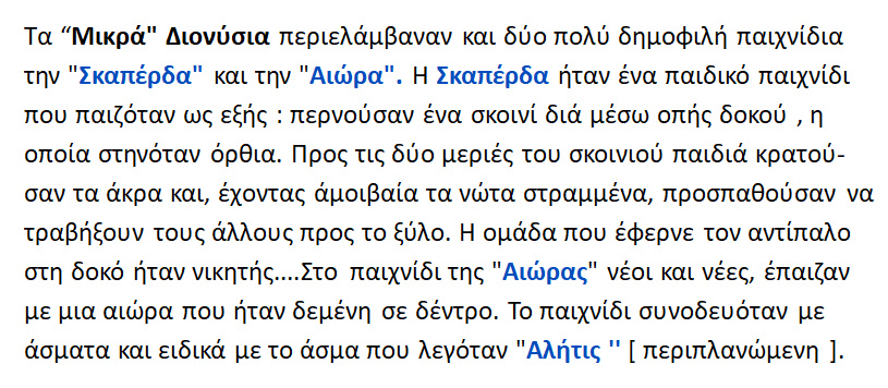 Τα ‘Μικρά’ ή ‘ κατ’αγρούς ‘ Διονύσια περιέλαμβαναν και δύο δημοφιλή παιχνίδια .