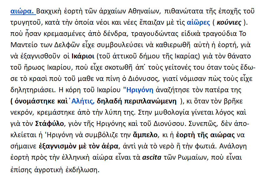 Αιώρα : Βακχική εορτή των Αρχαίων Αθηναίων ,προς εξαγνισμό των Ικαρίων . Η Ηριγόνη*, η Αλήτις** {=περιπλανώμενη} αναζητούσε τον πατέρα της κι όταν τον βρήκε νεκρό από την λύπη της απαγχονίστηκε.