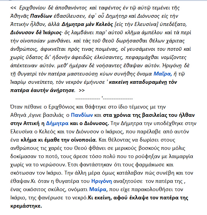Στην Ελευσίνα ,υποδέχτηκε την θεά Δήμητρα ο βασιλιάς Κελεός . Για να τον ευχαριστήσει η θεά του έδωσε τα Δημητριακά και τον έμαθε την καλλιέργεια αυτών. Στην Ικαρία { Αττικός δήμος όχι το νησί } υποδέχτηκε και φιλοξένησε τον θεό Διόνυσο ο Ικάριος . Για να τον ευχαριστήσει ο θεός του έδωσε το κλήμα [ άμπελος ] και του έμαθε την τέχνη της οινοποιίας .Ο Ικάριος χάριζε απλόχερα το θείο δώρο του Διονύσου κερνώντας οίνο και διδάσκοντας την αμπελουργία και την οινοποιία .Κάποιοι βοσκοί όμως υπό την επήρεια μέθης { από τον άκρατον οίνον } φόνευσαν τον Ικάριον . Η Μαίρα*** όμως ,το πιστό σκυλί του , οδήγησε την Ηριγόνη στον τόπο του φονικού. Η κόρη , από την μεγάλη λύπη της απαγχονίστηκε .Καταράστηκε όμως τους φονιάδες του πατέρα της , να τελειώσουν με τον ίδιο τρόπο την ζωή τους οι θυγατέρες τους .