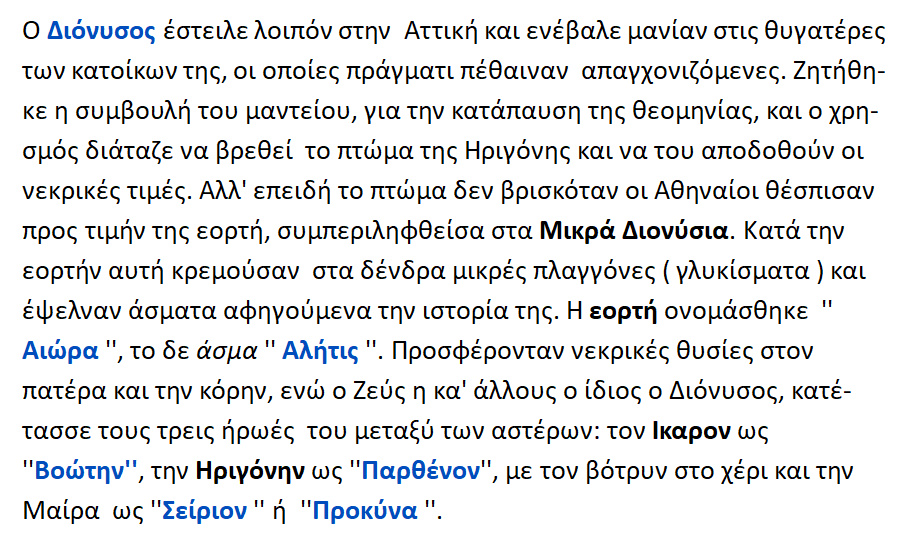 Ικάριον ως ΒΟΩΤΗΝ , Ηριγόνη ως ΠΑΡΘΕΝΟΝ , Μαίραν ως ΣΕΙΡΙΟΝ ή ως ΠΡΟΚΥΝΑ.