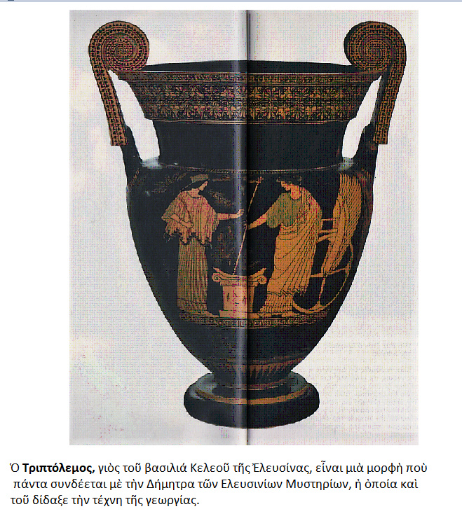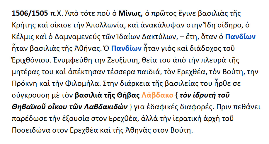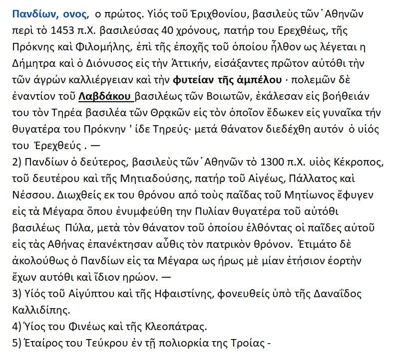 Κατά την βασιλεία του Πανδίωνος ήλθαν στην Αττική ο θεός ΔΙΟΝΥΣΟΣ {= οίνος }και η θεά ΔΗΜΗΤΡΑ {= άρτος }.