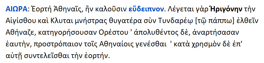 Αιώρα ,εορτή των Αθηναίων ,που την έλεγαν εύδειπνον .Λέγεται ,ότι η Ηριγόνη κόρη του Αιγίσθου και της Κλυταιμνήστρας με τον παππού της , τον Τυνδάρεων, ήρθε στην Αθήνα ως κατήγορος του Ορέστη { για τον φόνο των γονιών της }.Όταν όμως ο Άρειος πάγος απάλλαξε τον μητραλοίαν Ορέστην , αυτή απαγχονίστηκε για να γίνει άγος και μίασμα στους Αθηναίους .