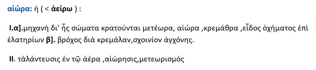 Αιώρα { αείρω } = μηχάνημα αιωρήσεως , κούνια , κρεμάστρα , είδος οχήματος επί ελατηρίων {;}.