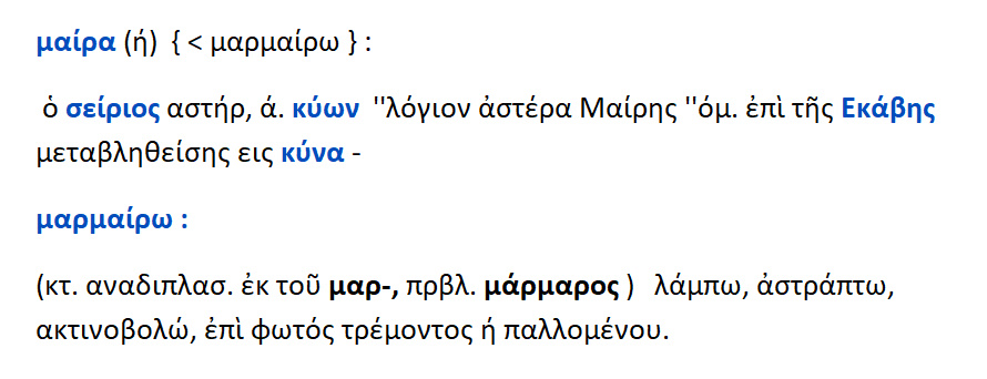***Μαίρα : εκ του μαίρω / μαρμαίρω.