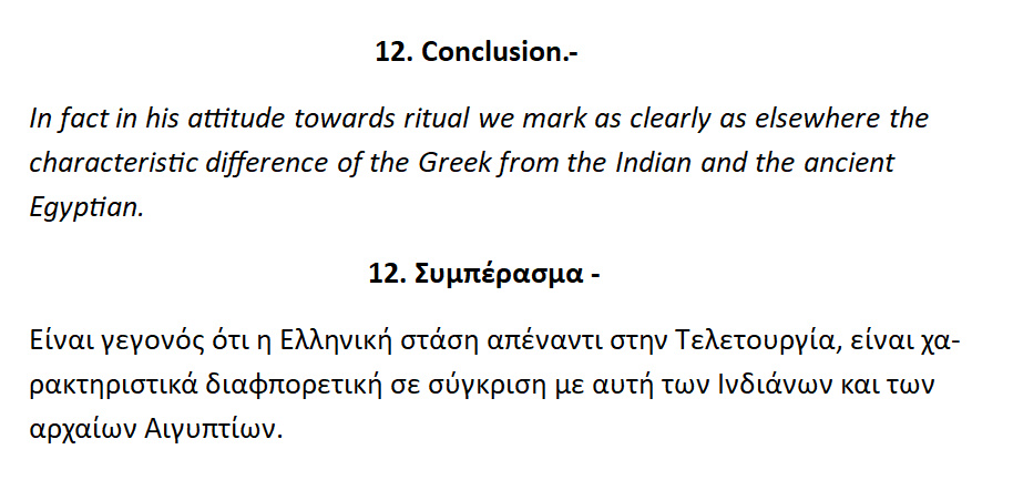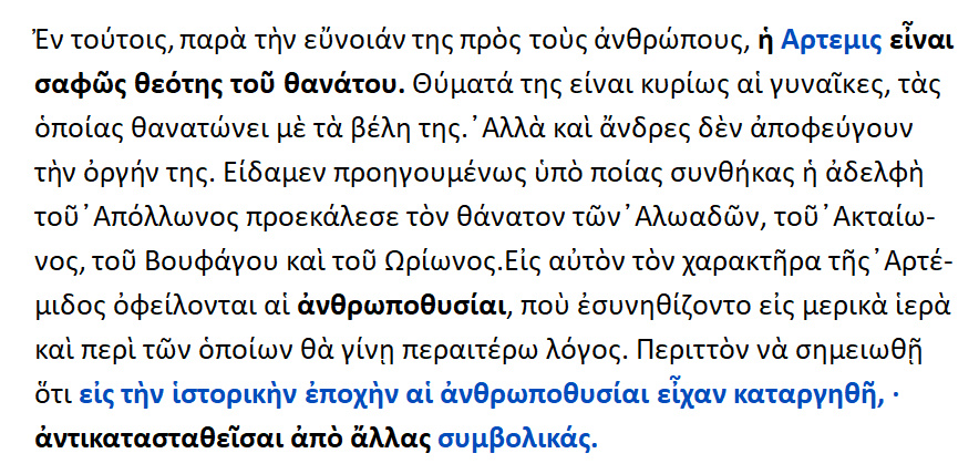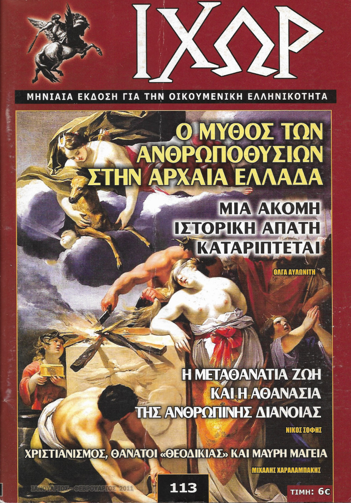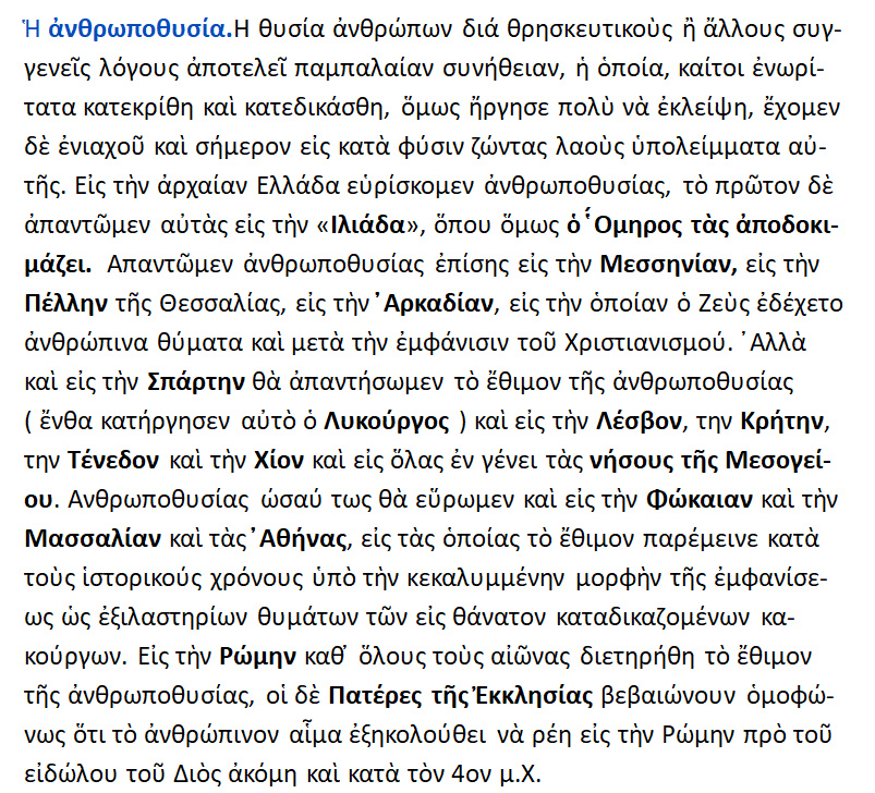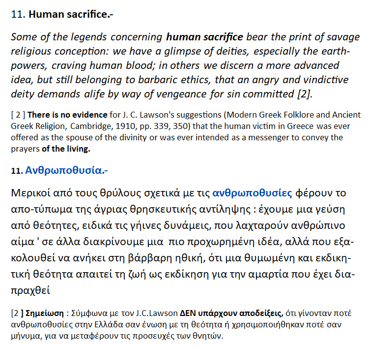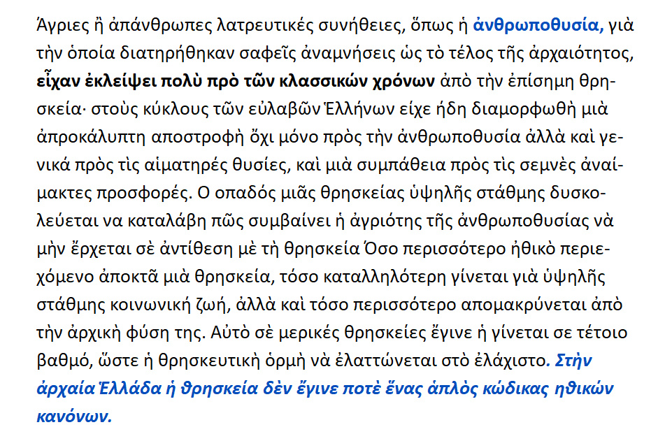 Οι απάνθρωπες λατρευτικές συνήθειες [ ανθρωποθυσία ] είχαν εκλείψει πολύ πρό των Κλασσικών χρόνων .Οι ευλαβείς Έλληνες είχαν μια απροκάλυπτη αποστροφή – όχι μόνο προς την ανθρωποθυσία αλλά και γενικά προς τις αιματηρές θυσίες.