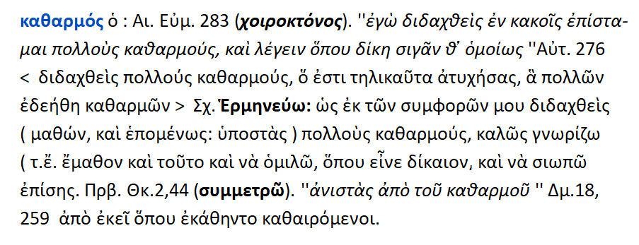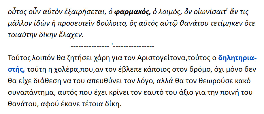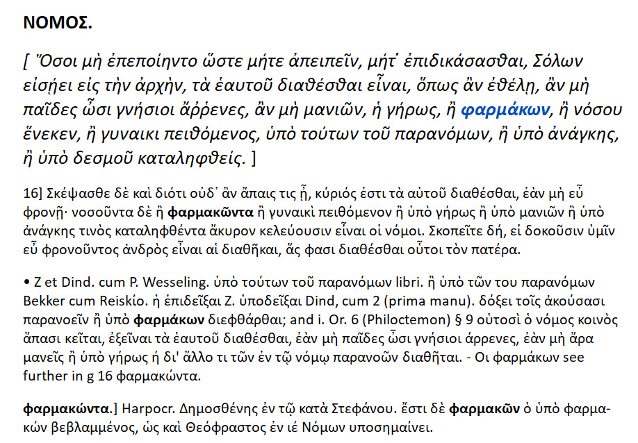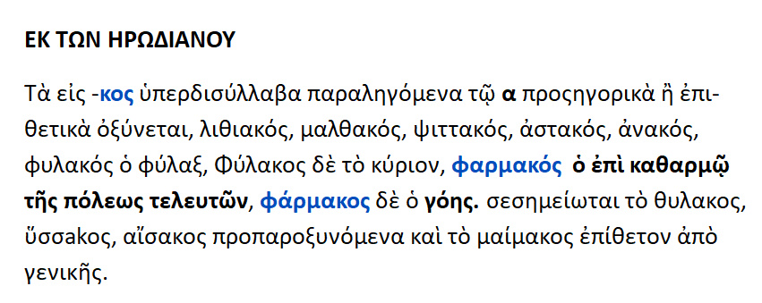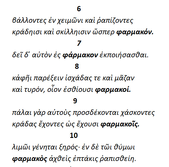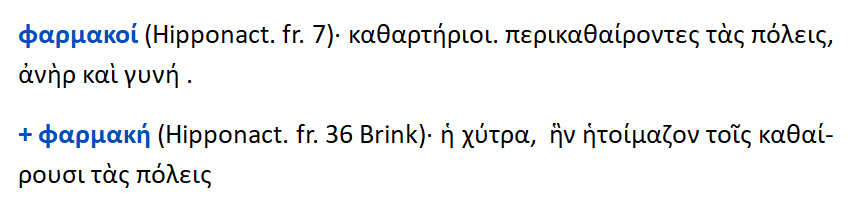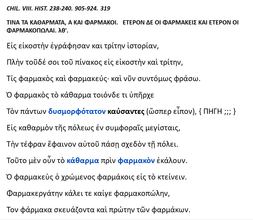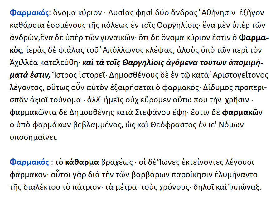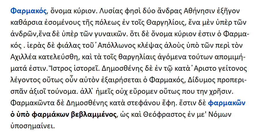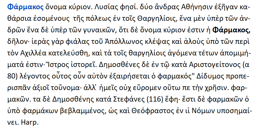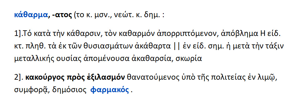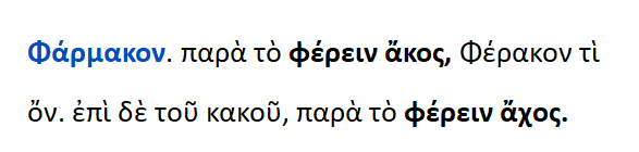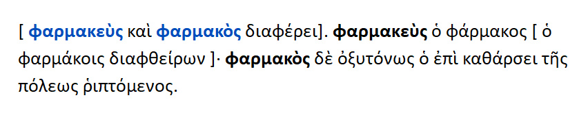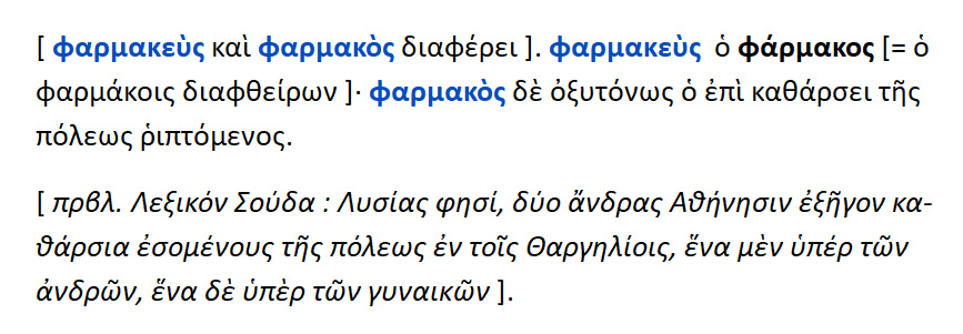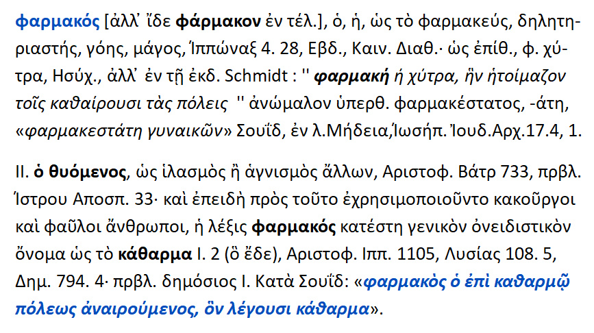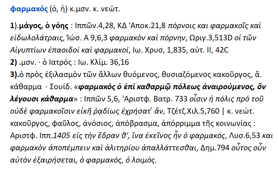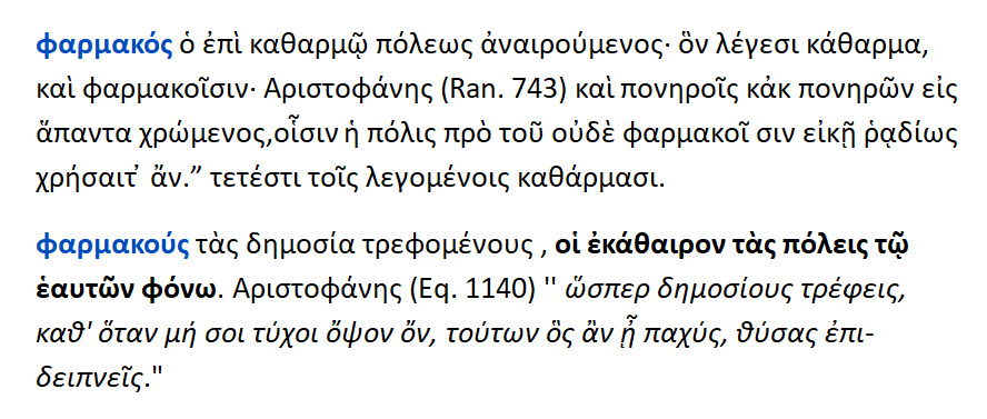 Φάρμακος , ο φαρμακεύς = ο διαφθείρων με φάρμακα. Φαρμακός =αυτός που ρίχνεται {;} για την κάθαρση της πόλεως.