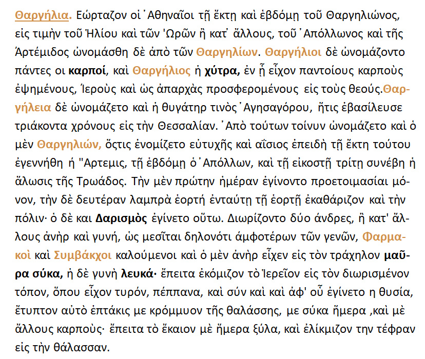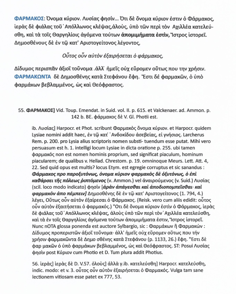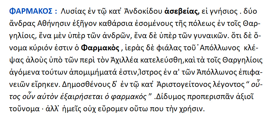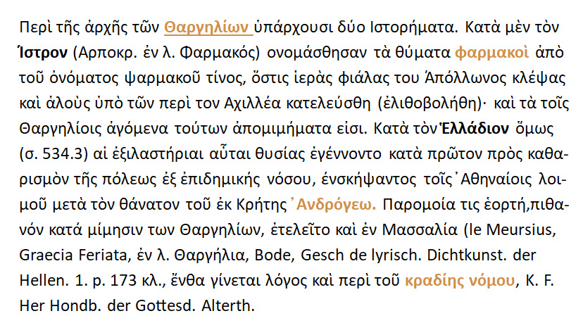 Στην αρχή μας διηγείται μία φανταστική ιστορία περί του Φαρμακού με σαφή επηρεασμό από τον ιαμβογράφο Ιππώνακτα τον Εφέσιο , ο οποίος όμως δεν αναφέρει καθόλου τα Θαργήλια. Περιγράφει δε μια {υποτιθέμενη ; } τιμωρία φαρμακού – ψευτομάγου- αγύρτη -γόη , μη θανατηφόρα αλλά μάλλον γελοιοφόρα : << επτάκις γαρ ραπίσαντες εις το πέος >> ,, !! [ Είναι αυτό, που νοιώθει ο αναγνώστης από την ισχύ των επιχειρημάτων : σεξουαλική ανατριχίλα ] Προσθέτει βέβαια και την προσωπική του γνώμη : 1].<< ήγον ως προς θυσίαν των πάντων αμορφότερον *{ = ασχημότερον } και 2].<< τέλος πυρί κατέκαιον εν ξύλοις >> . Και οι δυο αυτές ,είναι απόψεις άνευ αποδείξεων , όπως θα διαπιστώσετε . Συνεχίζει με ένα αμφίβολης αξίας απόσπασμα του Λυκόφρονος του Χαλκιδέως απ΄ το < σκοτεινό> ποίημά του » Αλεξάνδρα ή Κασσάνδρα » . Το ποίημα [εάν είναι του Λυκόφρονος ] είναι όντως σκοτεινό , δυσανάγνωστο έως μυστικιστικό. Τέλος δίνει ορισμούς για τις λέξεις φαρμακουργός , φαρμακεύς , φαρμακός.