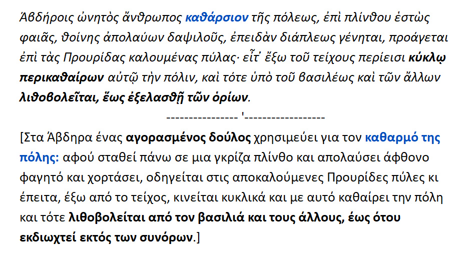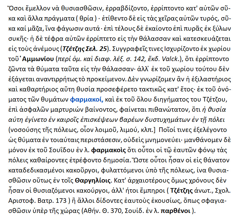 Οι φαρμακοί – καθάρματα. Το λεξικό κατά Ουλλιέλμον Σμίθ μεταφρασθέν υπό Σ.Τζιβανοπούλου , αναπαράγει τα ίδια επιχειρήματα και < αποδείξεις> με τον Ι.Τζέτζη και με το λεξικό Σούδα , τα οποία και εκτενώς ερευνήθηκαν στο προηγούμενο άρθρο. Ενδιαφέρον όμως έχει το τελευταίο μέρος του λήμματος . << Κατ’ αρχαιότερους χρόνους δεν ήσαν οι θυσιαζόμενοι κακούργοι , αλλά ήτοι έμπηροι {;}[Σύμφωνα με τα σχόλια του Ι. Τζέτζου στον Αριστοφάνη – Βάτραχοι { στ. 773 } – τα οποία προηγουμένως σχολιάσθησαν ] ή άλλοι εκουσίως προσφέρονταν για θυσία υπέρ της χώρας ! [ Αθήναιος .Θ’370 & Σούδα : παρθένοι ].